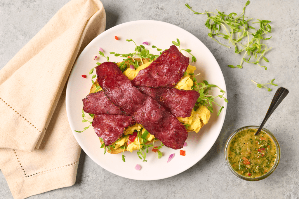 Butter the toast, Place your eggs on top, the peppers and onions the sprouts, and top with Steak bacon strips.